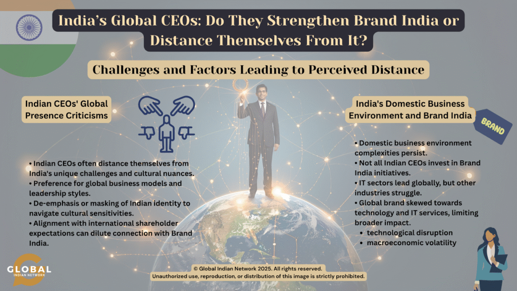 However, some critics argue that Indian CEOs operating on global stages often distance themselves from India’s unique challenges and cultural nuances to fit into established Western corporate norms. This distancing can be viewed in their preference for global business models and leadership styles that prioritize global market priorities over specifically Indian ones. CEOs of Indian origin may have to de-emphasize or mask their Indian identity to navigate cultural sensitivities or align with international shareholder expectations, which can dilute the connection with Brand India.
