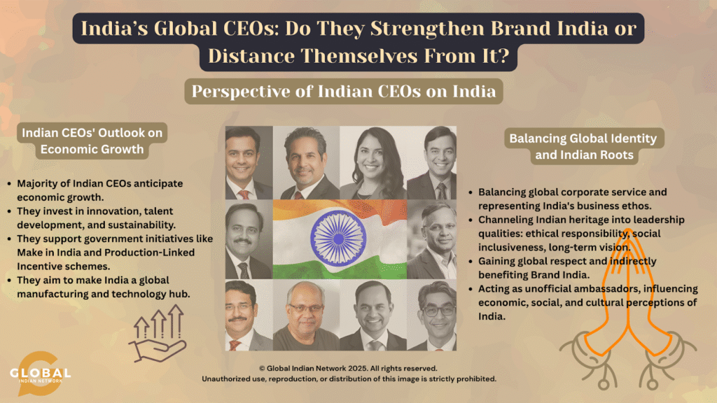 Recent data reveals Indian CEOs are optimistic about growth and are pioneering investments in AI, sustainability, and innovation, driving not only their companies but also India’s global economic influence forward. While some distance themselves from overtly nationalistic postures, their success stories and strategic choices project India’s evolving economic stature and promise. The path ahead requires ongoing efforts to deepen this connection, ensuring Indian values and strengths are integral to global leadership roles. The story of India’s global CEOs is thus one of transformative leadership, cautious progress, and emerging pride in Brand India’s growing stature on the world stage.