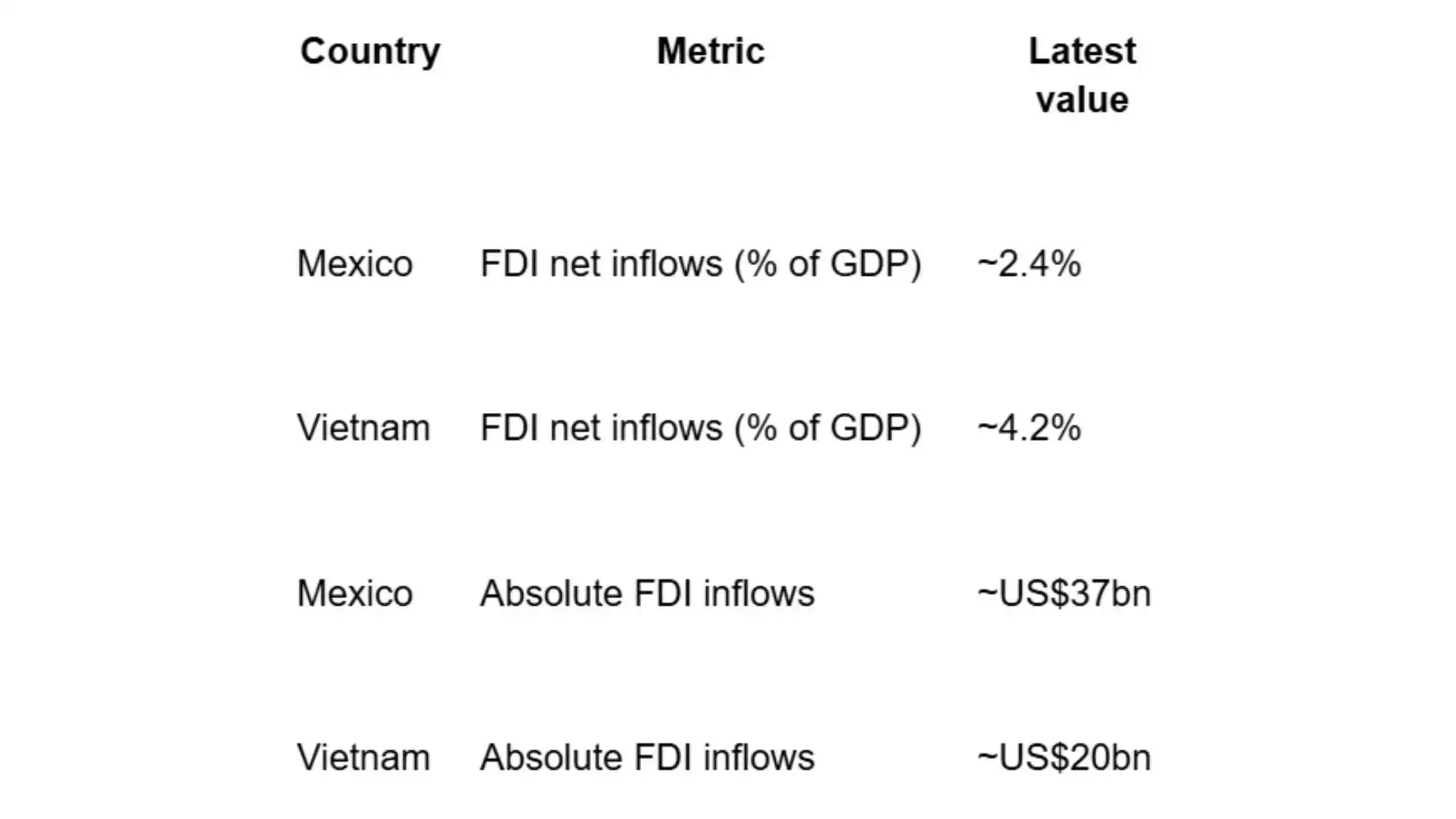 | Supply Chain Shifts | Near-shoring FDI flow volumes to Mexico/Vietnam |