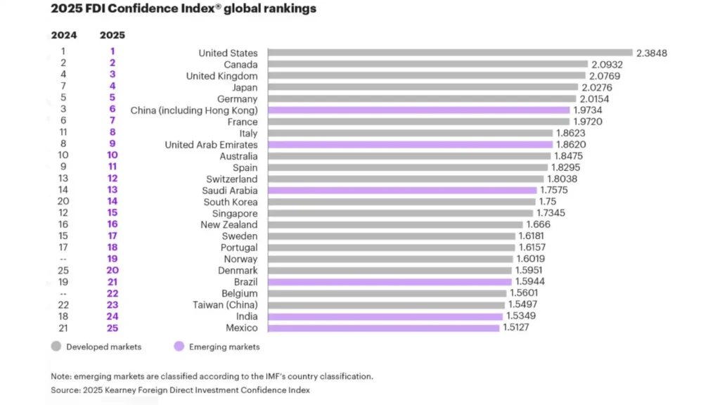 - Mexico: As a prime beneficiary of “near-shoring,” Mexico is leveraging its trade links with the U.S. to attract billions in manufacturing FDI.