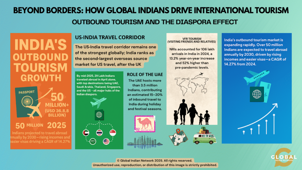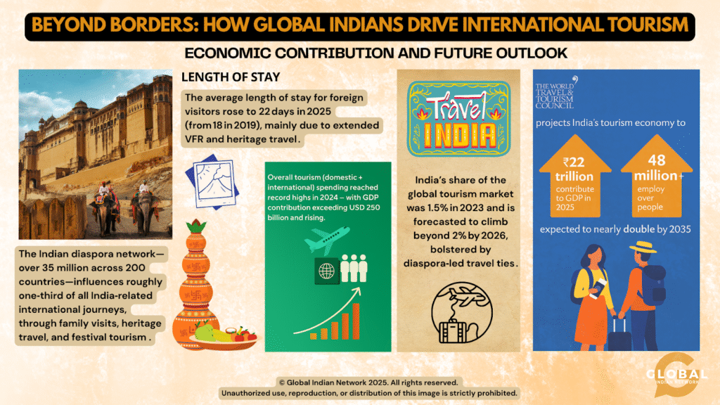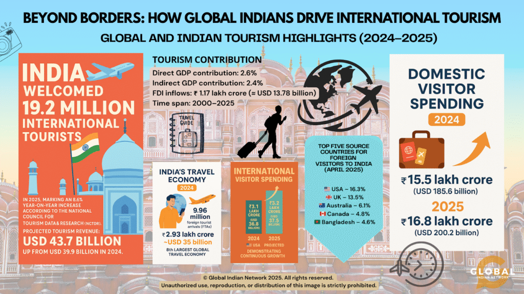 The link between global Indians and tourism runs deeper than travel statistics. It intertwines emotion, identity, and economics. Members of the global Indian community become both travelers and catalysts, visiting relatives, rediscovering roots, showcasing their adopted countries to family back home, and even shaping cross-border travel flows through their cultural presence.