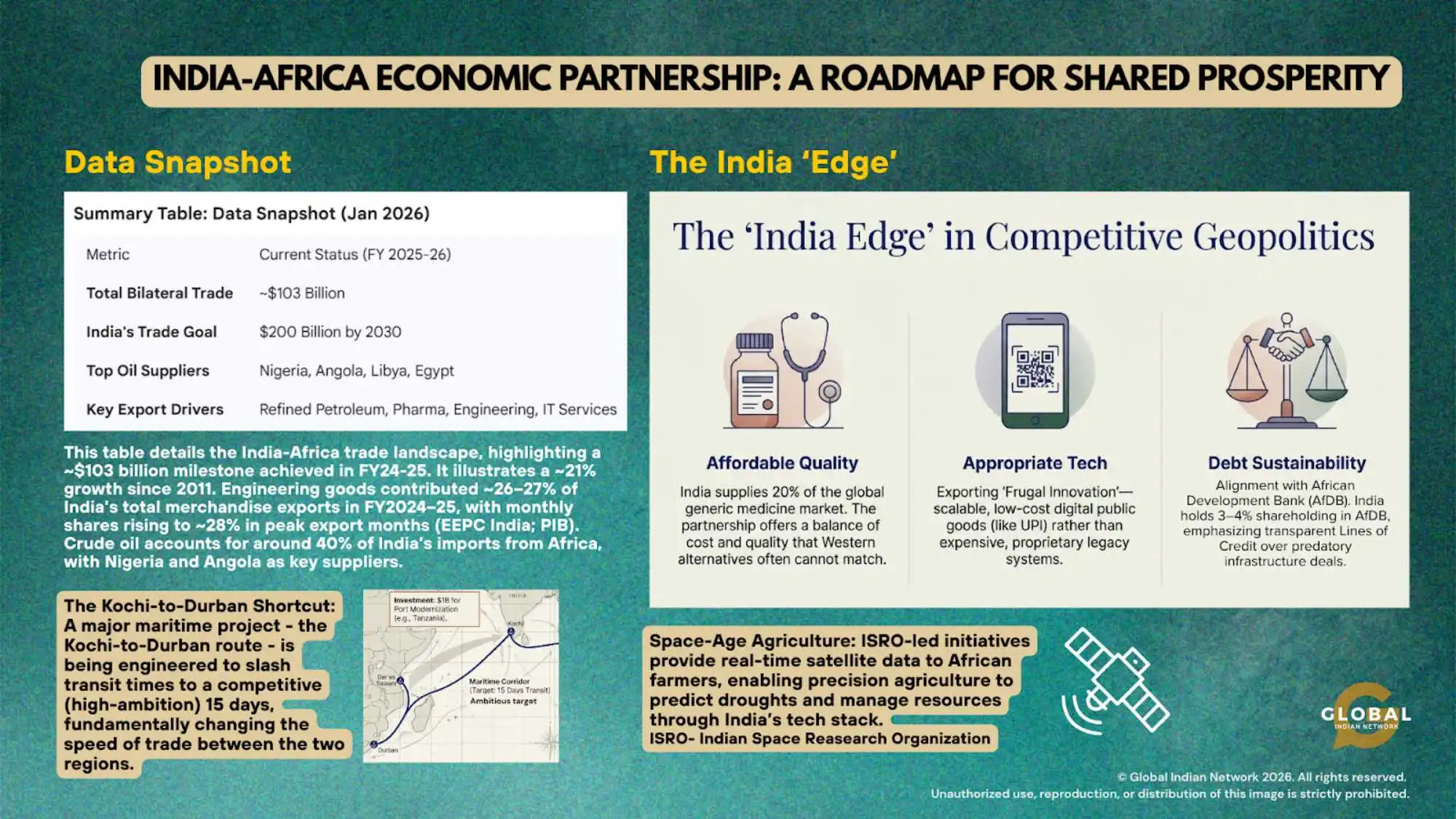 This article is based on publicly available data and policy materials from the Ministry of External Affairs and Ministry of Commerce (India), UN Comtrade, EXIM Bank of India, the African Development Bank (AfDB), the AfCFTA Secretariat, and the World Bank. Trade figures reflect the latest fiscal-year estimates (FY2024–25) and are reported in nominal USD.