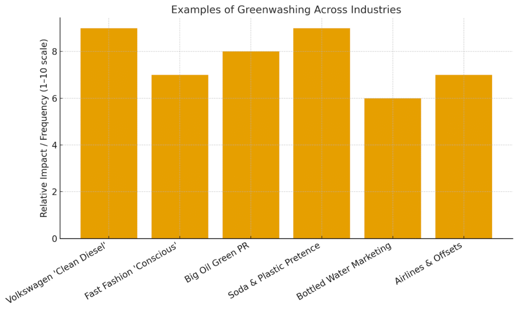 Common examples of greenwashing include “eco” labels on fast fashion, “clean diesel” cars that pollute more than claimed, oil companies promoting small renewable projects while expanding their fossil fuel operations, and soda giants marketing recycled plastic while increasing their production of single-use products.